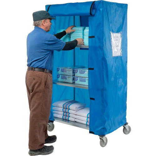 This versatile and economical linen cart is ideal for use in medical facilities or industrial facilities. Linen cart with blue nylon cover protects linens from airborne dust and dirt. Linen cart rolls easily on 5″ all swivel casters (2 with brakes). 1 Year Limited Warranty.