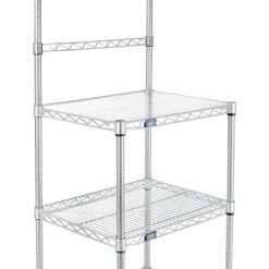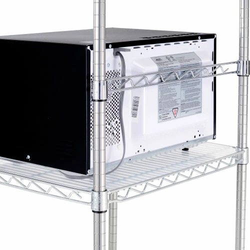 Single station microwave/food prep cart provides a convenient and accessible work surface for multiple environments including kitchens, breakrooms, cafeterias, and more. Shelves adjustable in 1″ increments allowing easy customization and display of dry ingredients, canned goods, utensils, and more. Carts feature 2″ Nylon swivel casters, 2 with brakes provide 300 lb. overall capacity. Poly-Z-Brite® features a clear powder-epoxy over zinc-chromate electro-plating that handles temperature and moisture extremes well. NEXGard®, an anti-microbial agent, protects the epoxy coating from bacteria, mold, and mildew that causes odors and product degradation. NSF listed for wet or dry use.