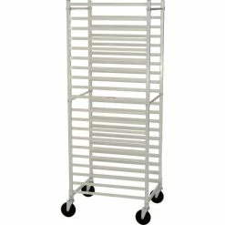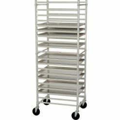 Nexel pan rack is made of aluminum for long lasting durability and corrosion resistance. Racks provide ergonomic tray access, transport and storage for processing plants, bakeries, restaurants, hospitals, buffets and more. Swivel casters allow convenient unit mobility, maneuverability and transport. Stores standard 18″ x 26″ sheet pans. Easy to assemble. Knock Down Pan Rack is End Load style. Pan tray capacity is 20 – pans sold separately. NSF certified.