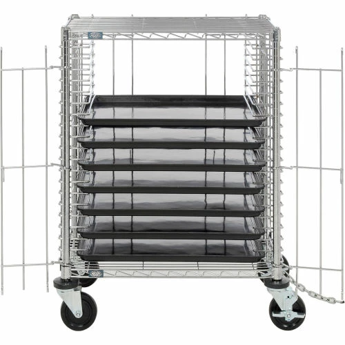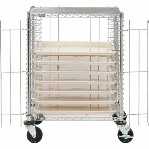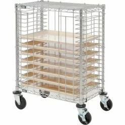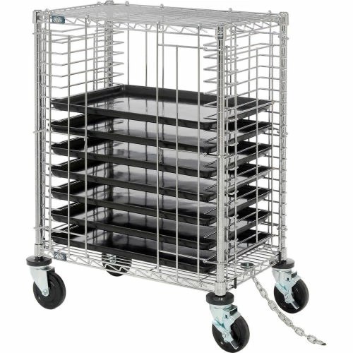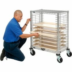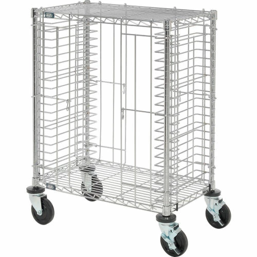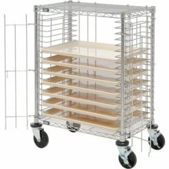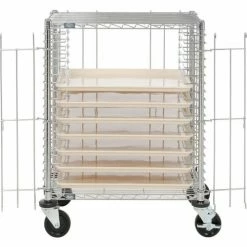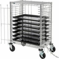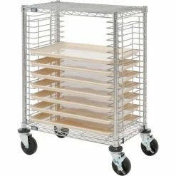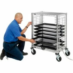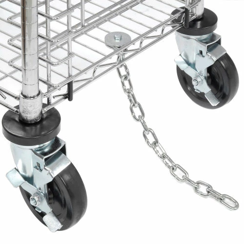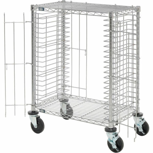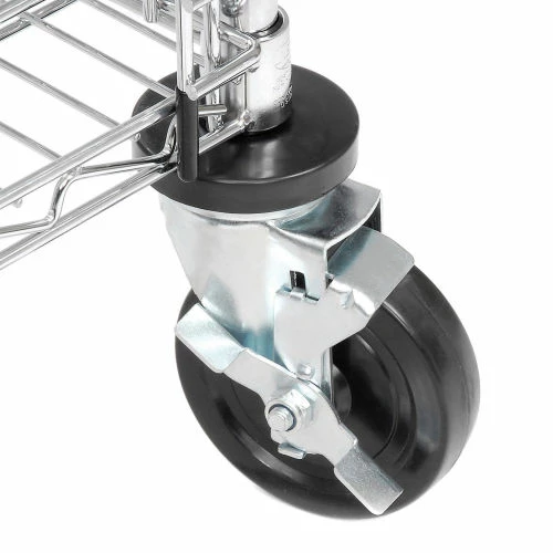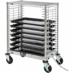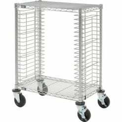 Side-Load Cart has open chrome-plated wire construction permits easy access and removal of contents. Allows maximum air circulation while minimizing dust accumulation. Rolls easily on 5″ x 1-1/4″ rubber swivel casters, 2 with brakes. Rubber bumpers help to protect walls. 1-1/2″ spacing between shelves.