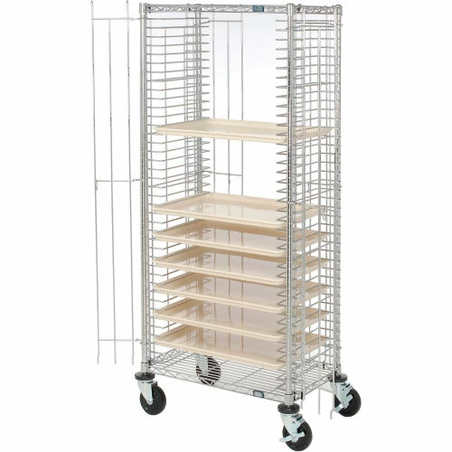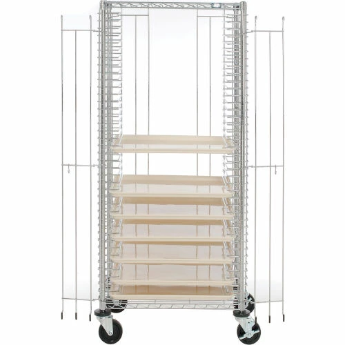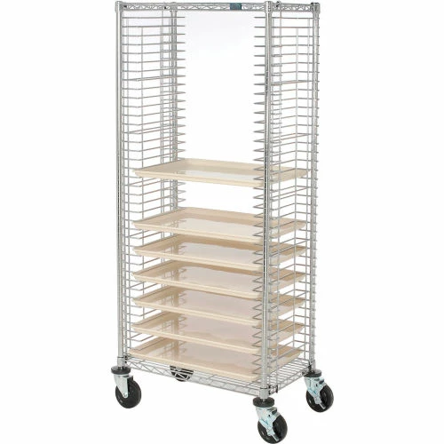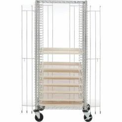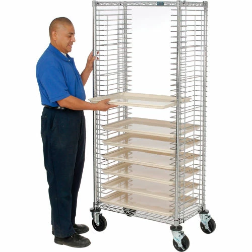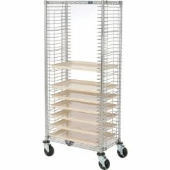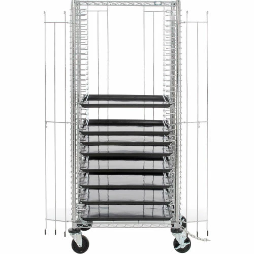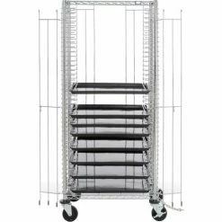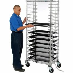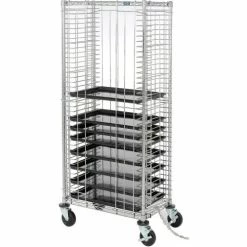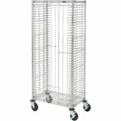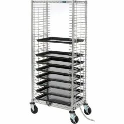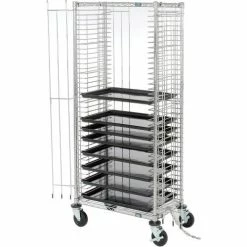 Our side-load tray trucks have open chrome-plated wire construction permits easy access and removal of trays and contents. Allows maximum air circulation while minimizing dust accumulation. Rolls easily on 5″ x 1-1/4″ rubber swivel casters, 2 with brakes. Rubber bumpers help to protect walls. 1-1/2″ spacing between shelves.