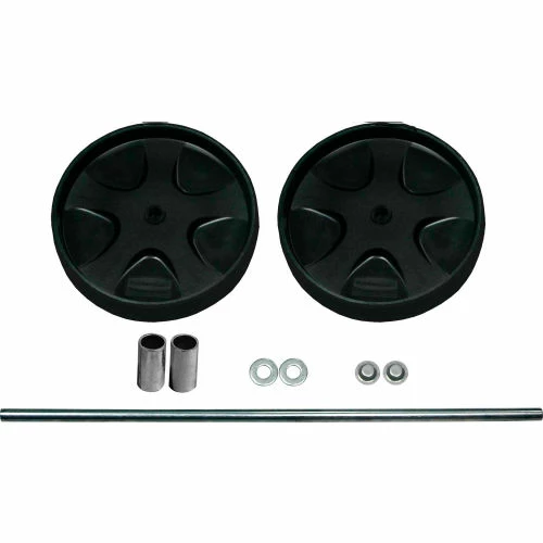 8″ Wheel Kit With Axle and Hardware. Includes (2) 8″ Wheels, (1) 1/2″ Diameter Axle, (2) 1/2″ Washers, (2) 1/2″ Pushnuts and (2) Axle Spacers. Fits Rubbermaid® Fg264600Bla, Fg61734700Bla, Fg617388Blue, Fg617388Bla, Fg618200Gray
