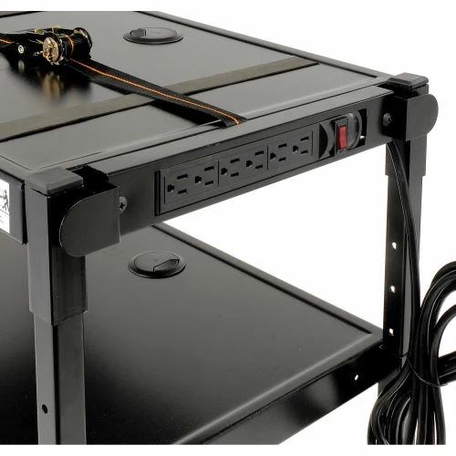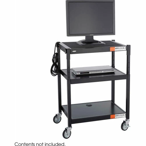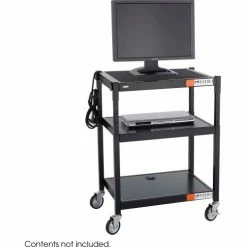 Make information accessible. This all steel cart is ideal for media equipment. Holds up to a 20″ monitor. Three outlet UL approved mini-surge protector with power switch. Three 24″ x 18″ shelves. Adjustable in 2″ increments from 28-36″ high. Mobile on four swivel casters (two locking).