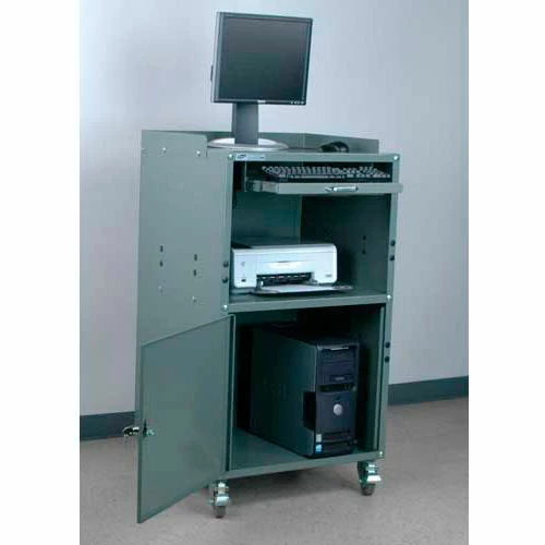 The standard mobile computer cabinet has all the space necessary to store the monitor, keyboard tray, CPU, and printer without taking up much space. All of our computer cabinets include the standard pull-out keyboard tray, and are punched out in the rear for wire routing. We offer units with and with-out the lower lockable door. Made in the USA.