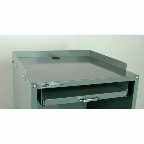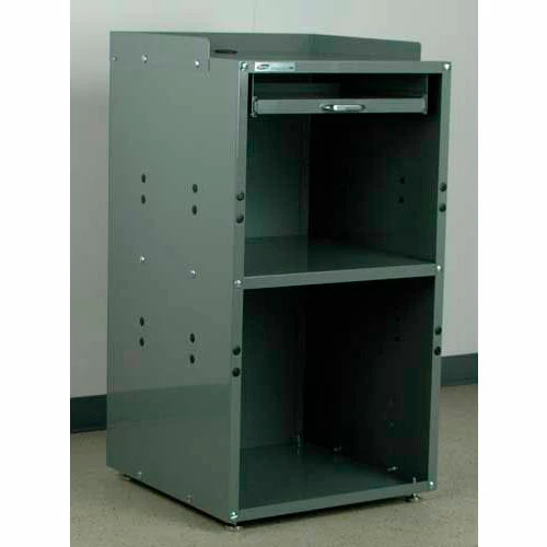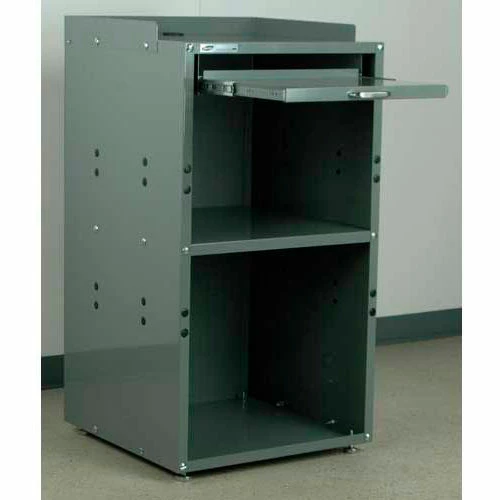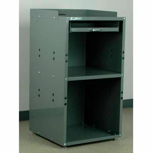 The basic open style computer cabinet features a simple (3) shelf design with a fixed height pull-out keyboard tray welded below the top shelf. The cabinet includes leveling glides, and both the rear panel and all shelves are punched with a 2″ hole for easy wire guidance. Made in the USA.