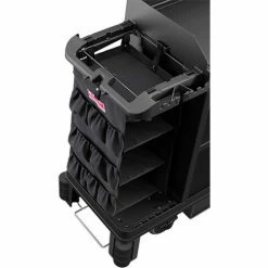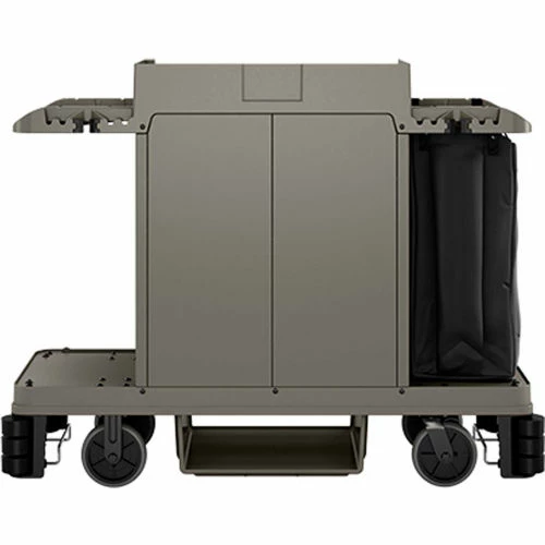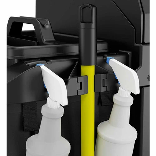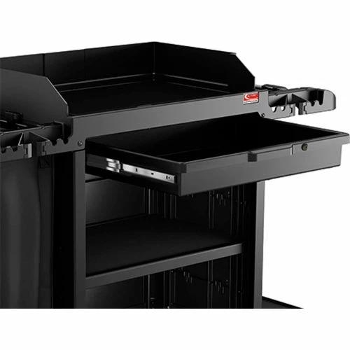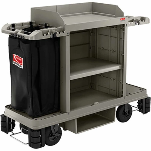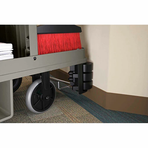 The Suncast Commercial standard housekeeping cart is an innovation in commercial maintenance, with its sleek design and durable construction, know that this product is built to handle whatever job it faces. This cart features 3 standard independent non-marring rollers in all four corners to protect walls from costly damage and comes standard with one laundry bag, two vacuum holders, a traditional glass rack and integrated tool storage for cleaning supplies. Maximize storage capacity with additional bag designs or a handy caddy that is designed to nest over the laundry bag to allow for optimal top space workflow.