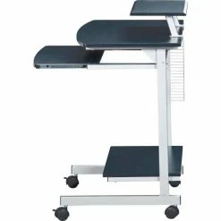 This Techni Mobili Compact Computer Desk is made with heavy-duty engineered wood panels with a moisture resistant PVC laminate veneer and a scratch-resistant powder-coated steel frame. The adjustable shelf can be mounted center, right or left of desktop. It also features a slide-out keyboard shelf equipped with a safety stop, side media rack for CDs or DVDs, bottom accessory shelf, large bottom shelf to accommodate a CPU and accessories, and large double-wheel non-marking locking casters. The desktop has a 100 lb weight capacity, the shelves each have a 30 lb weight capacity, and the keyboard shelf can hold up to 20 lbs. COLOR: Graphite.