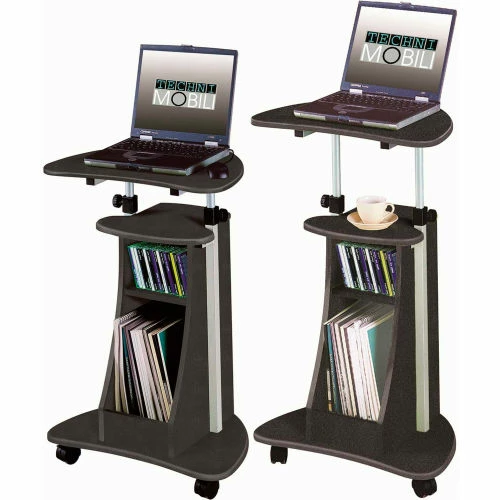 The Techni Mobili Sit-to-Stand Rolling Laptop Cart with Storage saves space while providing the laptop or writing setup you need. You can easily adjust the table height from 28″ to 43″ with dual adjustment knobs. The open storage compartment features an accessory shelf. Two of the fours non-marking nylon casters include a locking mechanism. The table top, accessory, and bottom shelves each have a 22 lbs. weight capacity and made of MDF panels with a moisture laminate veneer and a scratch-resistant powder-coated steel frame. Color: Graphite.
