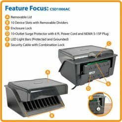 The CSD1006AC locks with the included keys to help prevent theft, damage or tampering. A cable with combination lock is also included to secure the charging station to a desk, table, cart or other flat surface. The six-foot AC input cord with NEMA 5-15P plug helps you place the charging station in a convenient location. Storage shelf dividers are easily removed to accommodate thicker devices. Cabling is secured beneath the shelf tray to alleviate clutter. The CSD1006AC comes with a 1-year lifetime warranty.