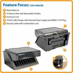 Devices fit into slots 1.25 inches wide and plug into the 10 USB ports as needed for proficient charging. The CSD1006USB delivers up to 5V 2.4A per port, which is plenty of power for charging battery-intensive devices. To protect your devices, the CSD1006USB prevents them from drawing more power than it is capable of supporting and stops charging a device when the device’s battery is at 100%.
