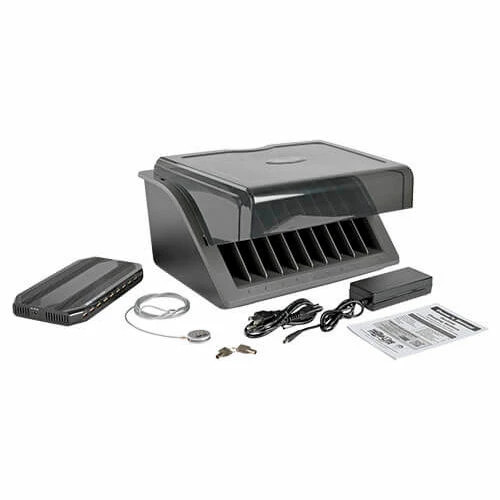 The CSD1006USB locks with the included keys to help prevent theft, damage or tampering. A cable with combination lock is also included to secure the charging station to a desk, table, cart or other flat surface. The six-foot AC input cord with NEMA 5-15P plug helps you place the charging station in a convenient location. Storage shelf dividers are easily removed to accommodate thicker devices. Cabling is secured beneath the shelf tray to alleviate clutter. The CSD1006USB comes with a 1-year lifetime warranty.