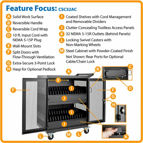 The CSC32AC 32-Device AC Charging Station Cart provides AC charging, secure storage and cord management for up to 32 Chromebooks and laptops. It’s recommended for education, office, commercial, retail, industrial and healthcare environments.