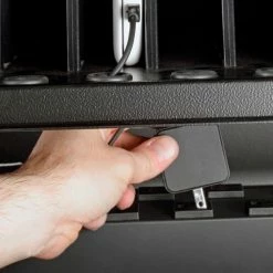 32 AC outlets provide convenient charging for Chromebooks and laptops with a screen size up to 17 inches. Their AC adapters plug into the cart’s 32 NEMA 5-15R outlets as needed, up to 1,440 total watts. The CSC32AC also charges tablets and other USB devices through their power adapters. A built-in circuit breaker protects against overloads. The 10-foot AC input cord with NEMA 5-15P plug reaches distant outlets to help you place the cart in a convenient location.