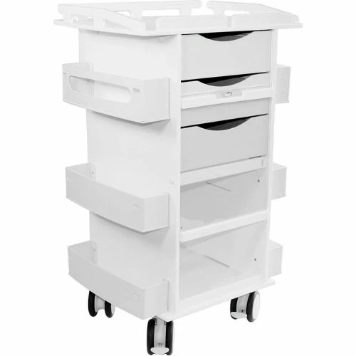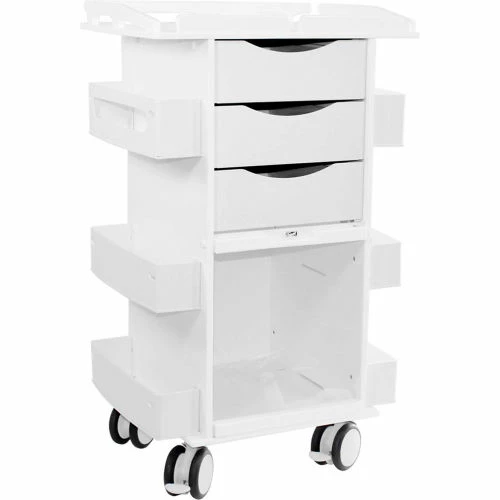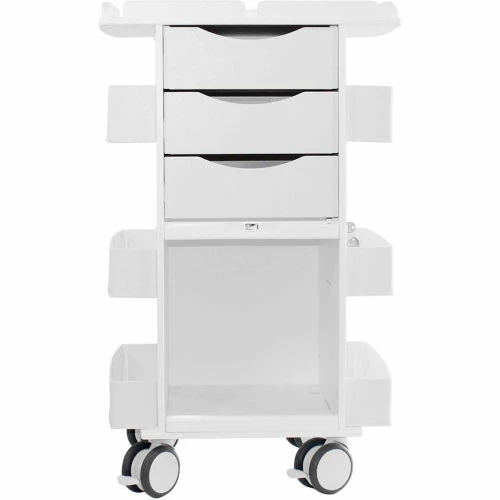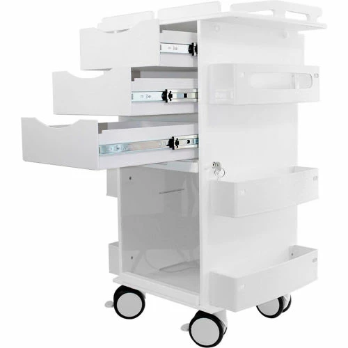 - 1 inch Rail top, 2 Locking & 2 Swivel 4in Twin Wheel Casters,, 3 Total Locking Drawers, 6 Side Shelves, Locking Bulk Storage with Sliding Drawer