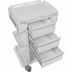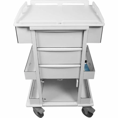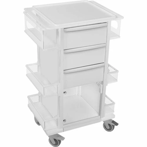 - 3 Full Extension Drawers, 2 Dispensing Bins, Four Side Shelves, Keyed Lock Bulk Storage Area, 4 Inch Casters.