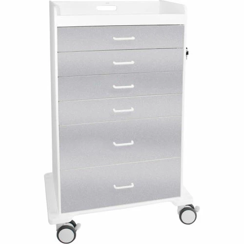 TrippNT’s Procedure Cart with Metallic Silver Drawers is a wide push cart with high capacity storage for anesthesia procedure. This cart offers 6 full-extension total locking drawers, 4-inch twin wheel casters, 2 locking, 2 swivel, and a built-in tray top with an easy to grab handle. The durable construction consists of Corrosion resistant Polyethylene, ABS, and PETG. Available in 13 color variants. Ships Fully Assembled.