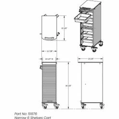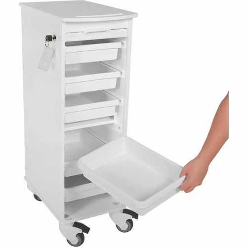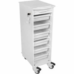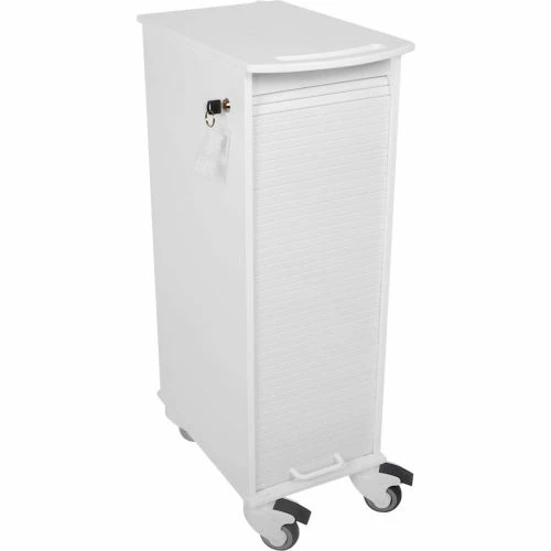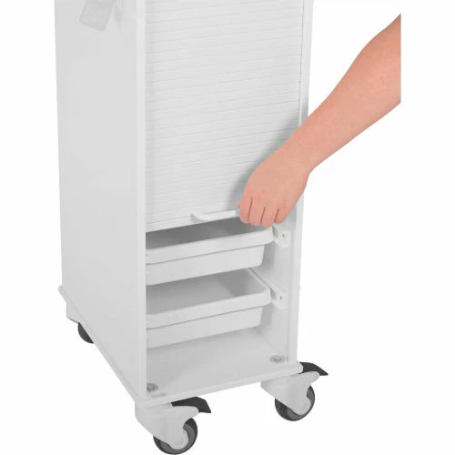 - 2 Locking Casters, 2 Swivel Casters, 6 Removable Pocket Trays and White Locking Roll Top Door