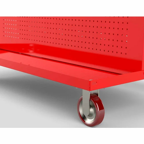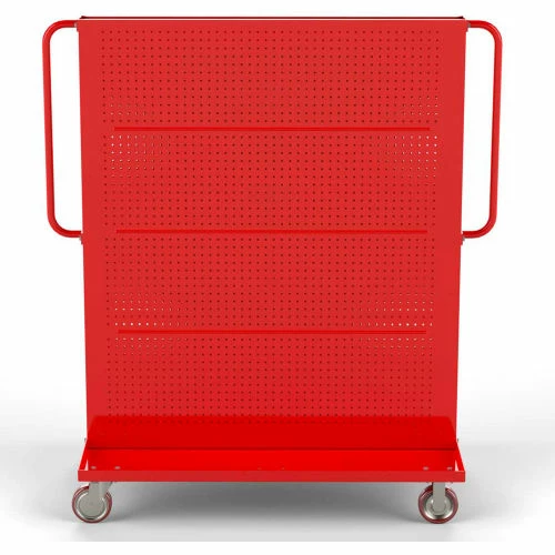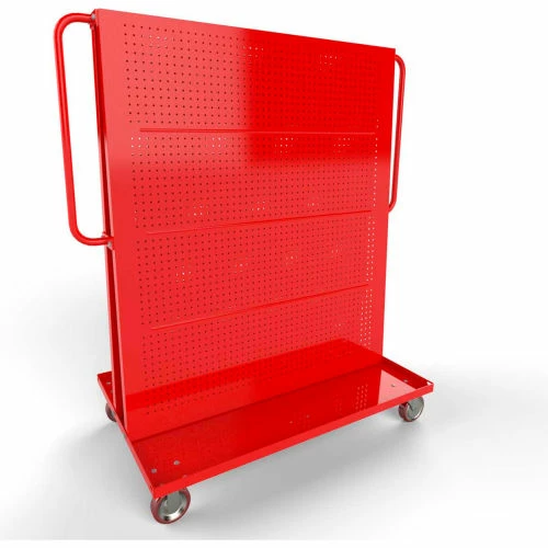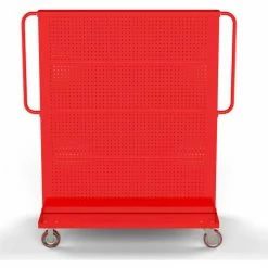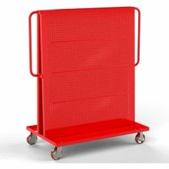 Valley Craft’s 48 in. Red Modular A-Frame Bin Cart features 2 circle peg pegboard panels, heavy duty steel construction, 6 in. phenolic casters (2 rigid, 2 swivel) and a 2,000 lb. load capacity. Combine with standard hooks for efficient organization of parts and supplies. Highly customizable and great for lean manufacturing and Kaizen events. Deck features a 1 1/2″ lip with 10″ of deck space on each side of the panel for extra storage. Optional floor lock available. Optional end panels can add up to 3,000-sq. inches of additional storage space. Bins are not included.