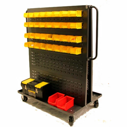Valley Craft’s 36 in. Red Modular A-Frame Bin Cart features 1 circle peg Pegboard Panel panel and 1 louver panel, heavy duty steel construction, 6 in. phenolic casters (2 rigid, 2 swivel) and a 2,000 lb. load capacity. Combine with standard hooks and bins for efficient organization of parts and supplies. Highly customizable and great for lean manufacturing and Kaizen events. Deck features a 1 1/2″ lip with 10″ of deck space on each side of the panel for extra storage. Optional floor lock available. Optional end panels can add up to 3,000-sq. inches of additional storage space. Bins are not included.