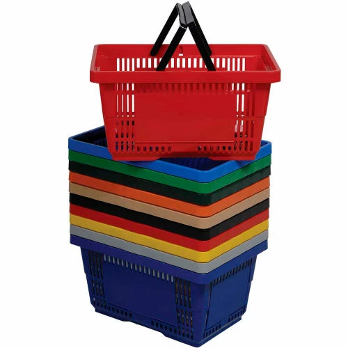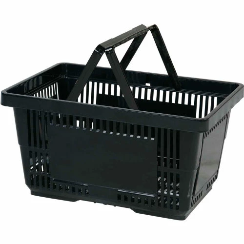 Plastic hand shopping baskets allow flush nesting for compact storage. Grocery Baskets are great for retail and shopping environments, as well as, stock and storage applications. Made of impact resistant polypropylene. Baskets include folding nylon handles with comfort grip and hand holds in 2 ends for easy lifting. Built-in label areas for identification. Baskets can be easily nested on Hand Shopping Basket Stands (sold separately) for easy storage that creates a convenient pick-up and drop-off station in stores.