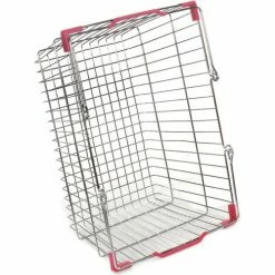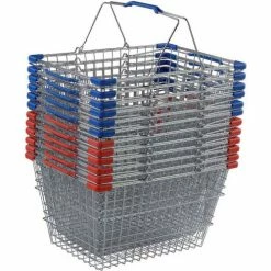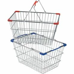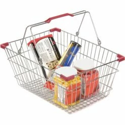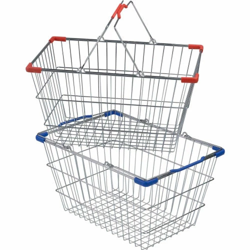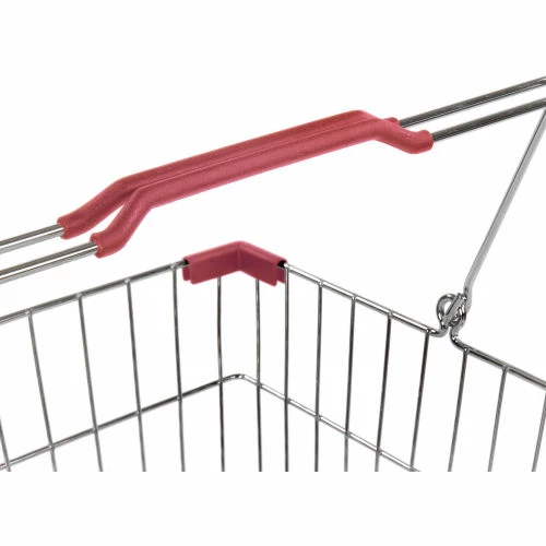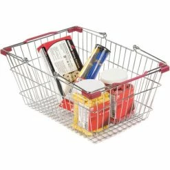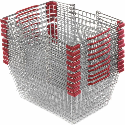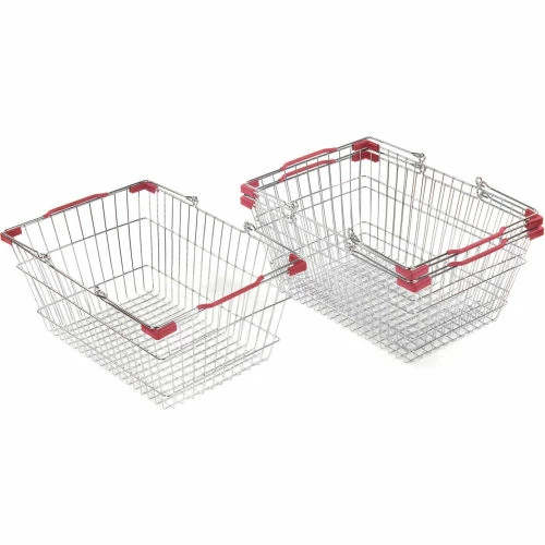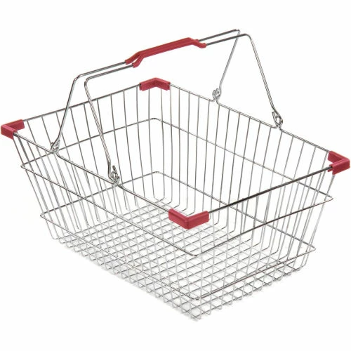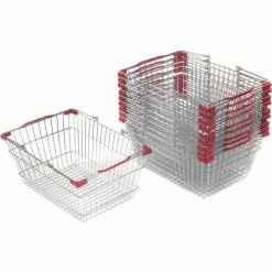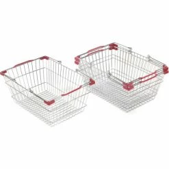 Shopping baskets are made using heavy duty steel wire with chrome finish for an attractive appearance. Wire baskets feature corner guards for safety. Folding handles have a Red grip for comfort. Shopping basket measures 18″L x 12-3/4″W x 10″H overall. Sold in quantities of 20.